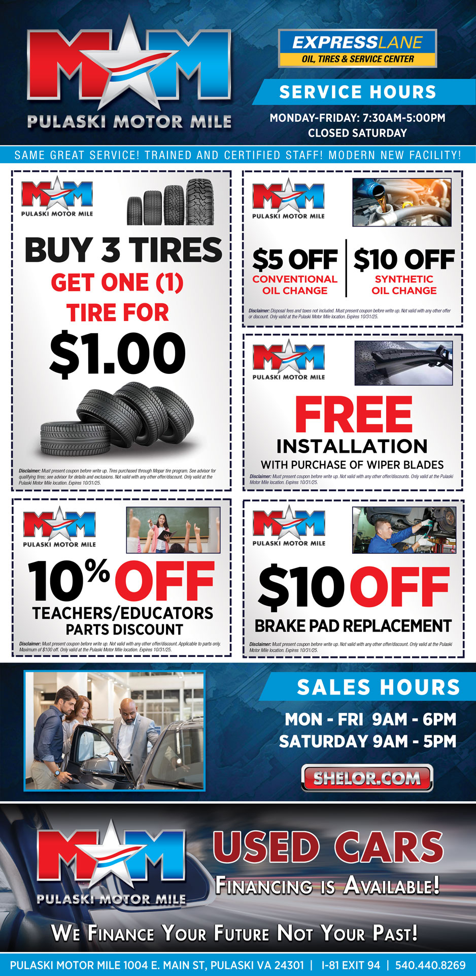 The Pulaski Motor Mile Express Lane is proud to offer our customers the following discounts. Stop by soon and let us service your vehicle!