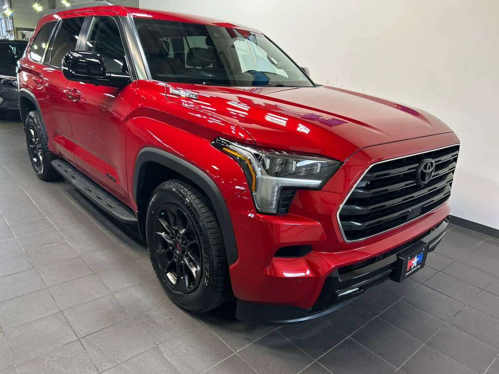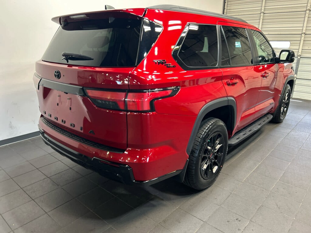 TRD OFF-ROAD black badging on rear pillars, off-road suspension w/Bilstein shocks, skid plate, red TRD engine start button, red front-axle drive shafts, TRD leather shift knob, aluminum sport pedals, electronically controlled locking rear differential, Multi-Terrain Select (MTS), Crawl Control (CRAWL) and Downhill Assist Control (DAC), Multi-Terrain Back Monitor, Wheels: 20 Black TRD Alloy, Tires: 265/60R20 All-Terrain, subwoofer and amplifier, Wireless Smartphone Charger, Qi-compatible w/charge indicator light, POWER TILT/SLIDE PANORAMIC ROOF W/POWER SUNSHADE, LED daytime running lights (DRL), sequential turn signals and auto on/off feature. Toyota Limited with Supersonic Red exterior and Boulder interior features a V6 Cylinder Engine with 437 HP at 5200 RPM*. Serviced here, Originally bought here, New Tires, Local Trade-In